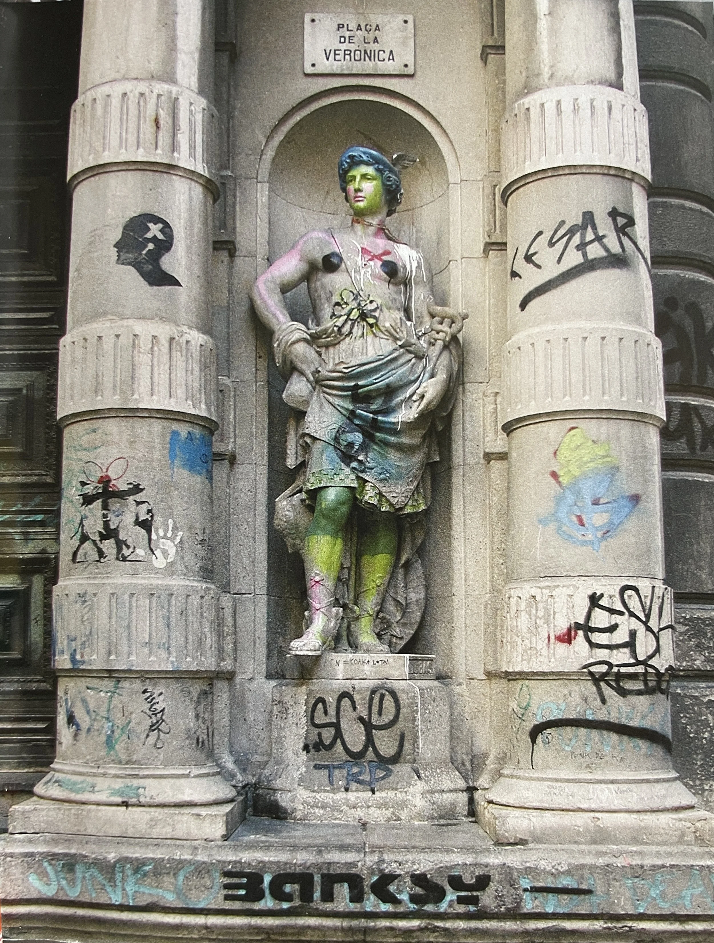 This image is featured on page 5 of Banksy's Wall and Piece book. You can see the "xerrajeros" logo on the left column. When we moved to Barcelona, the Gothic Quarter seemed abandoned. We would graffitti our logo all around town and other European cities when we traveled. Around that same time, banksy was starting to appear outside of the UK. This is Fine Arts Academy building on Plaça de la Veronica. It was in the works of being restored and the students had been giving permission to "decorate" as they wished, we came along after the students, as did banksy.